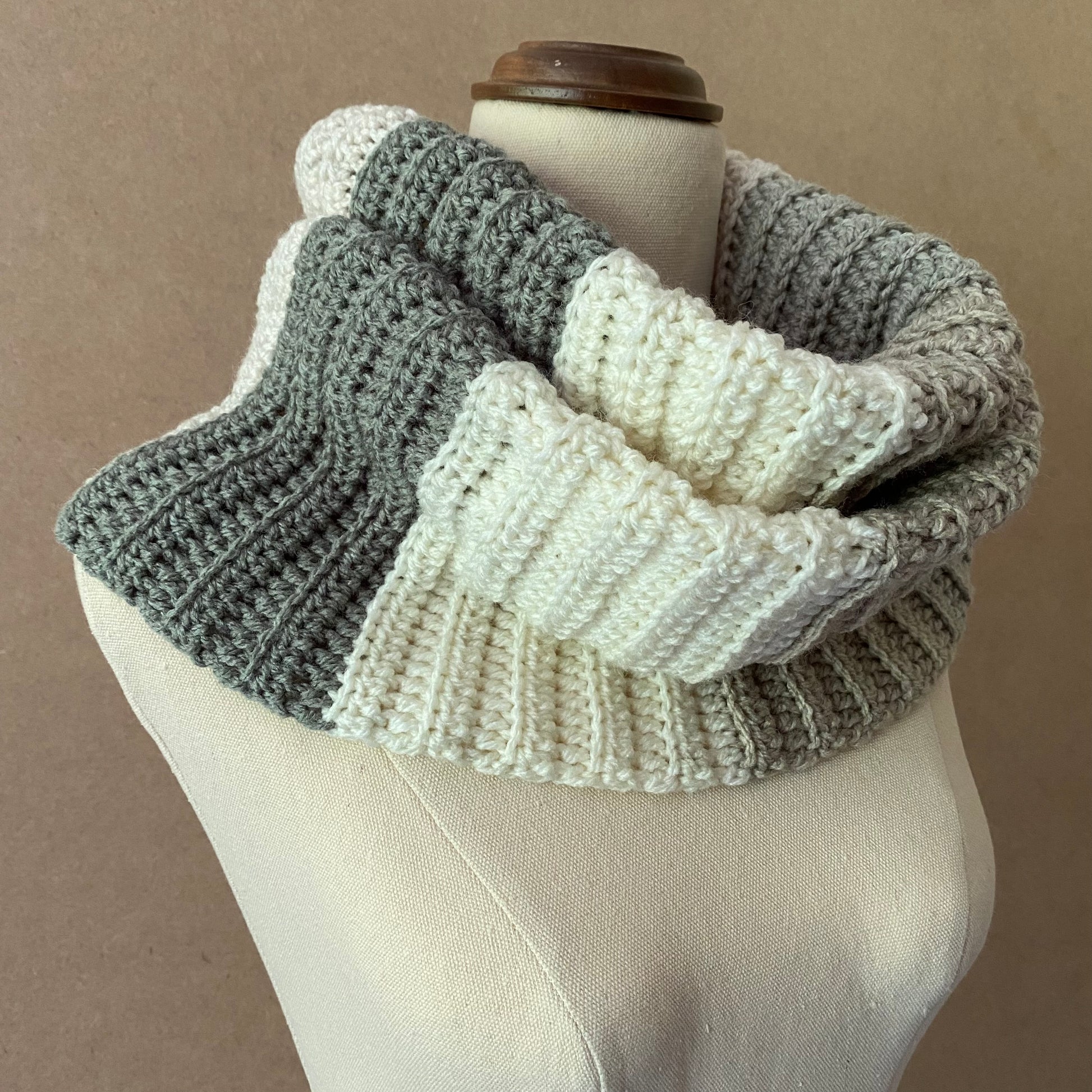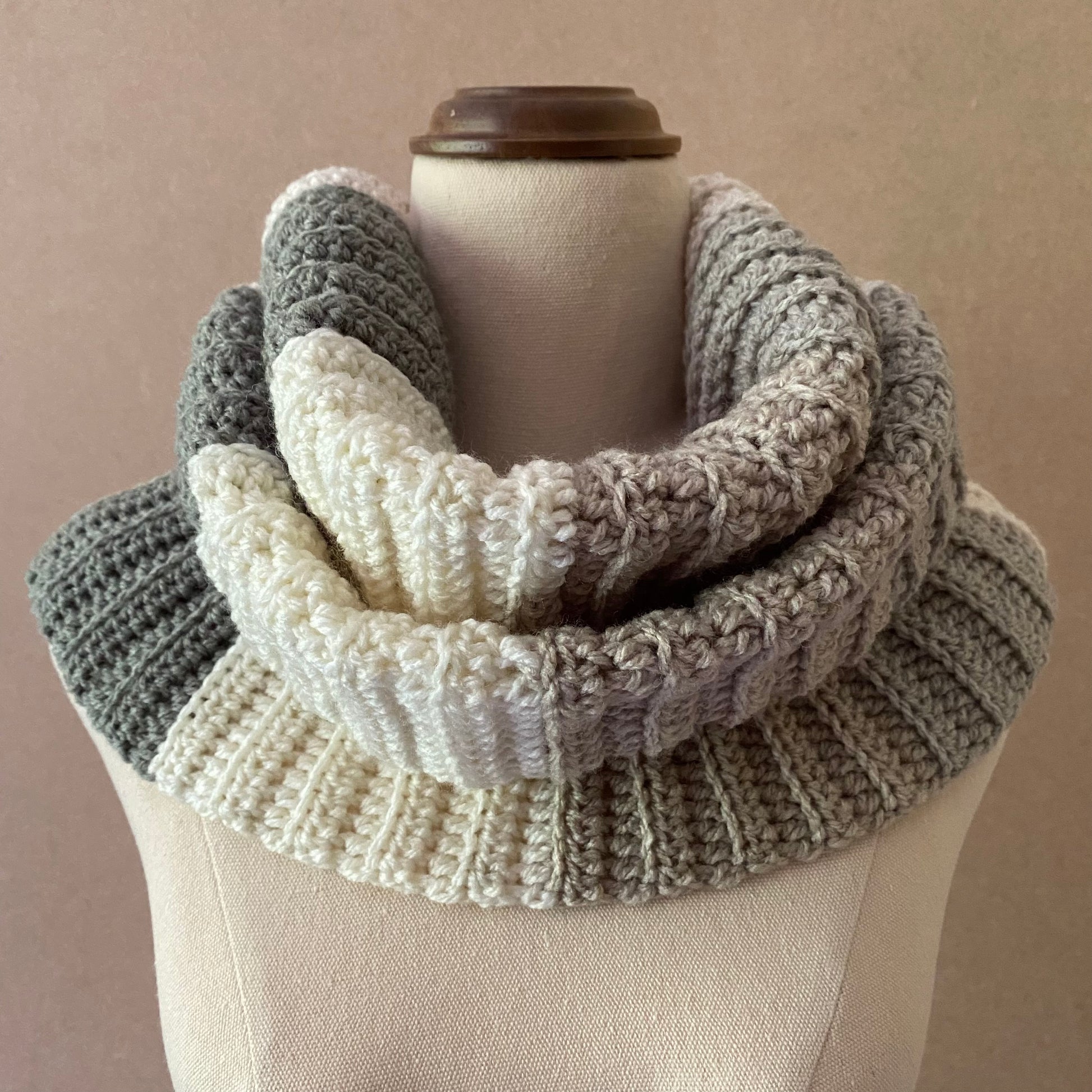 The yarn used for this item is Caron Cakes, White Truffle colourway.