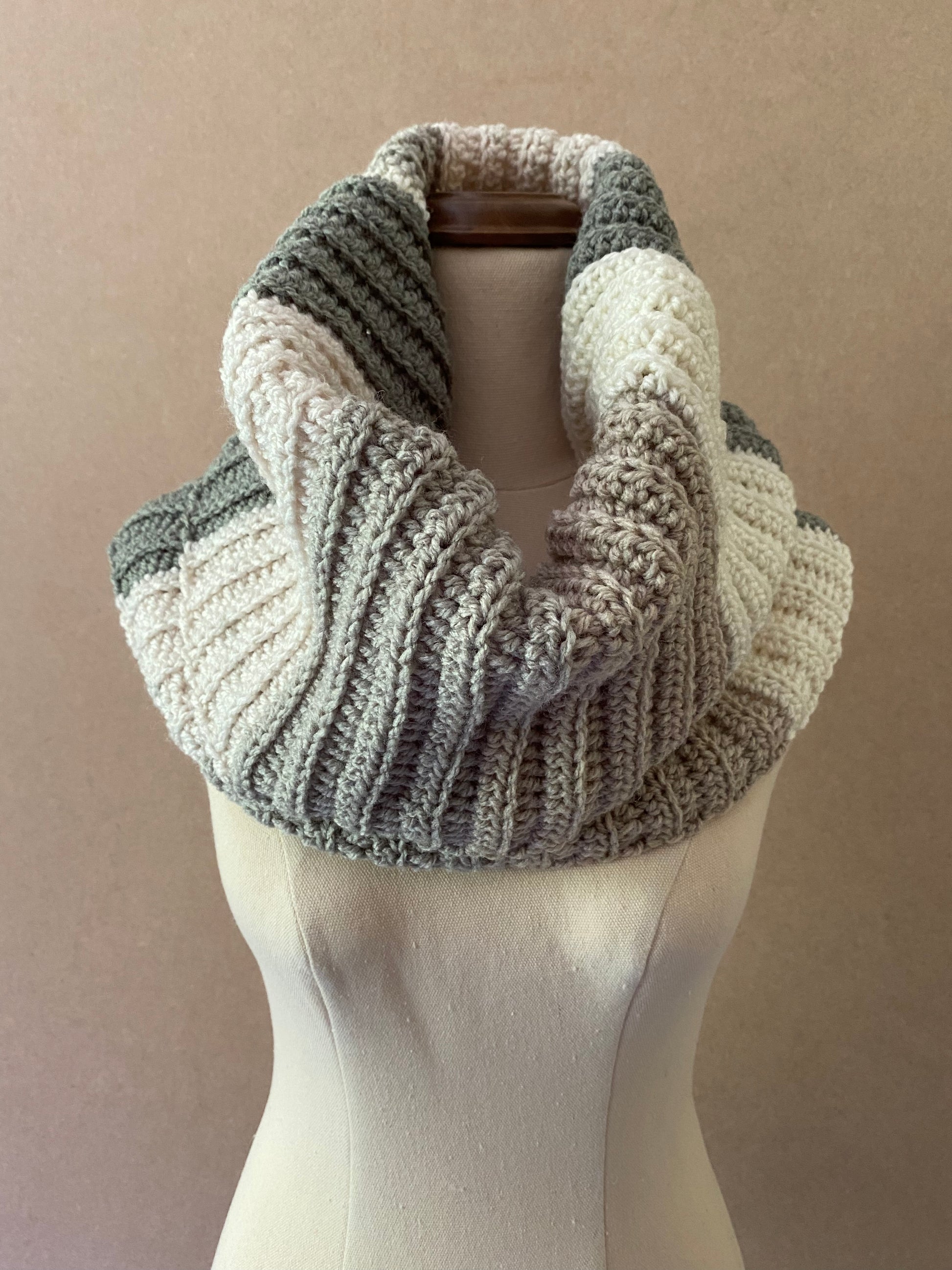 This beautiful handmade cowl has gorgeous earthly tones, and the lovely texture from the pattern makes this cowl very soft and warm, perfect to spruce up your outfit for a night out!